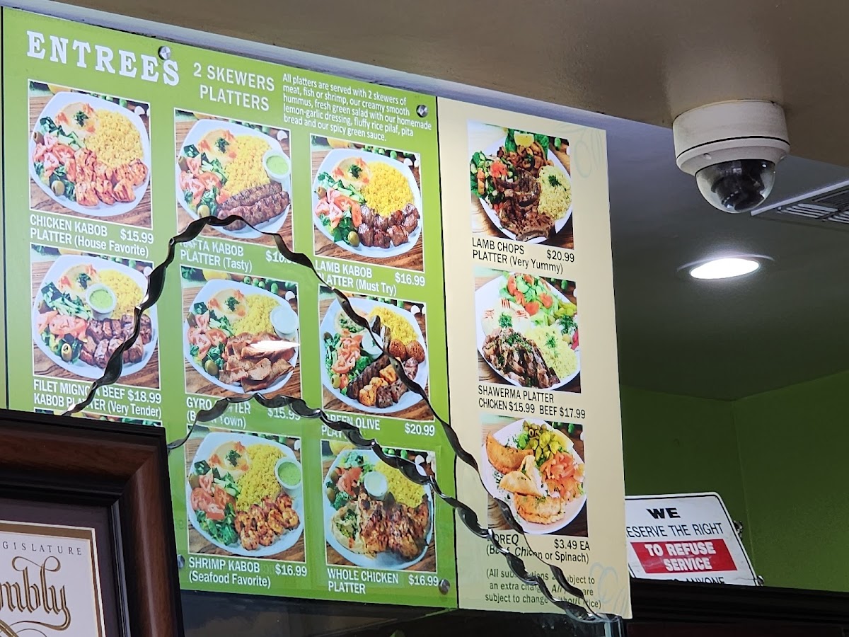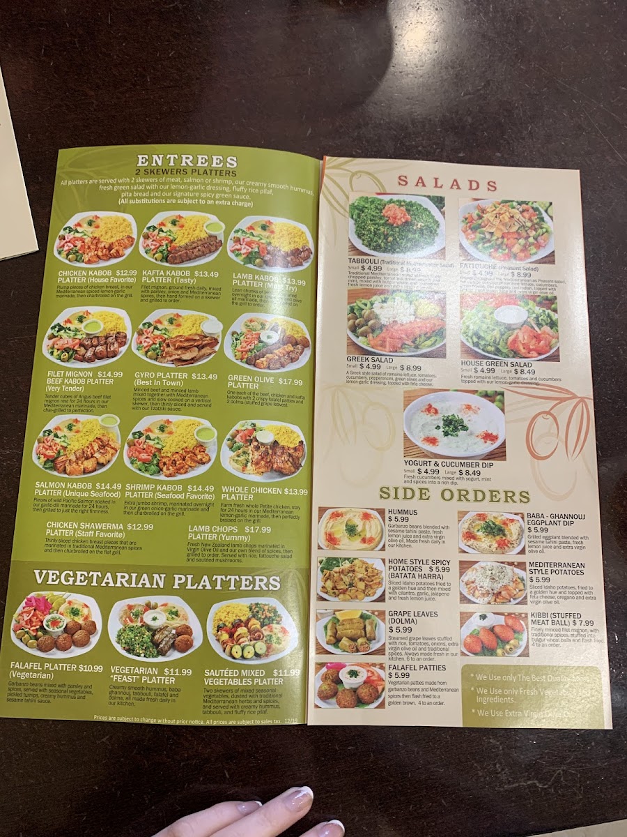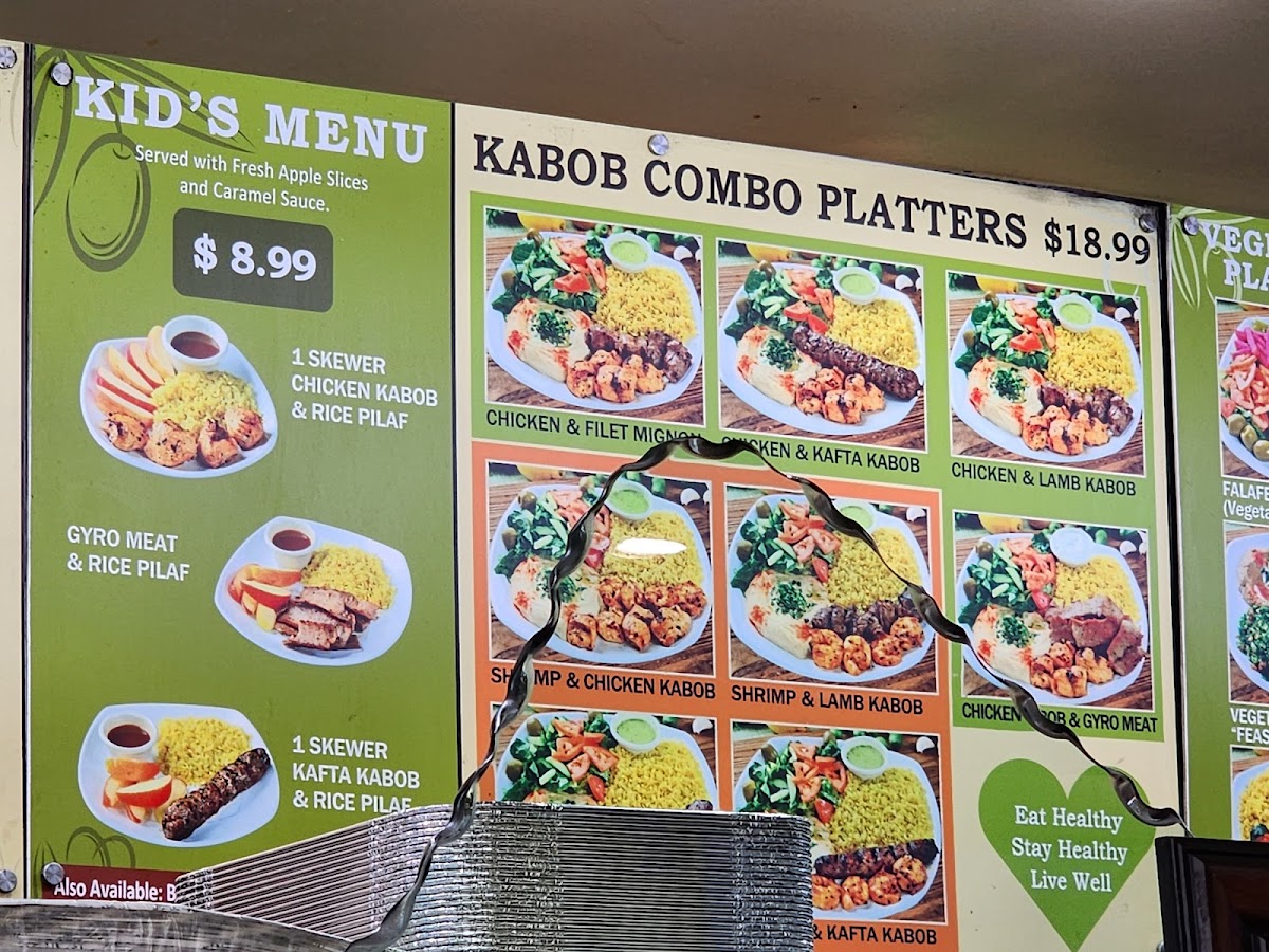 Highlights like the Filet Mignon and Chicken Kebabs, Gyro, and Falafel wraps invite diners to enjoy familiar favorites, while options such as the Green Olive Platter, Tabbouleh, and Baklava provide a taste of authentic Mediterranean cuisine. Many guests find these dishes equally well-suited for a quick, flavorful meal or a leisurely gathering with friends and family.